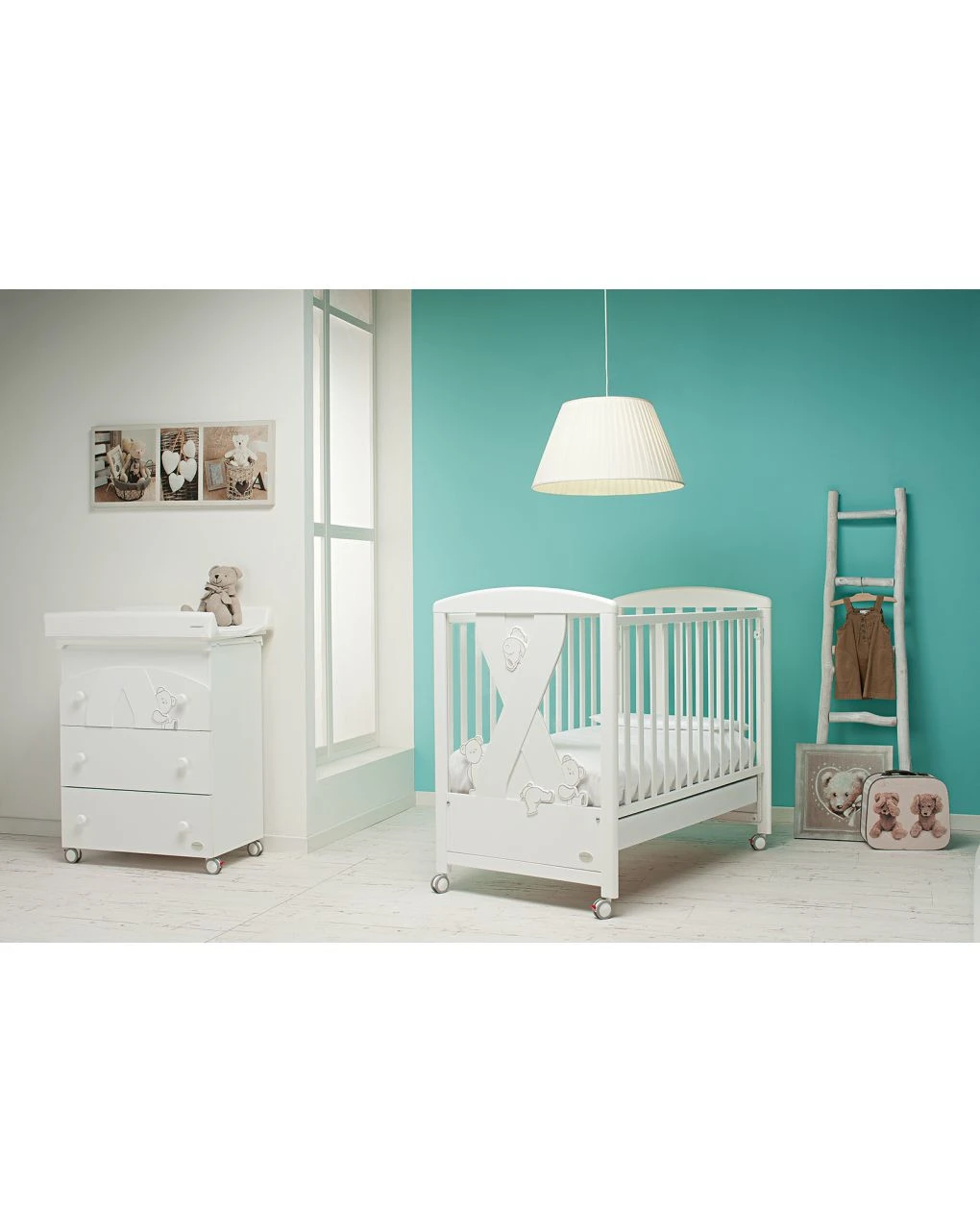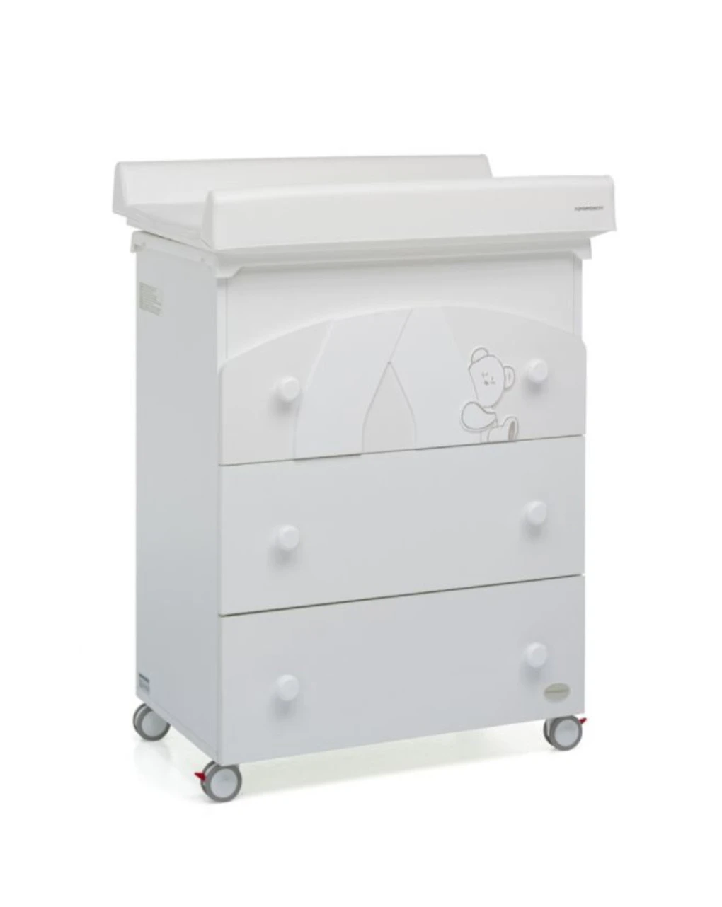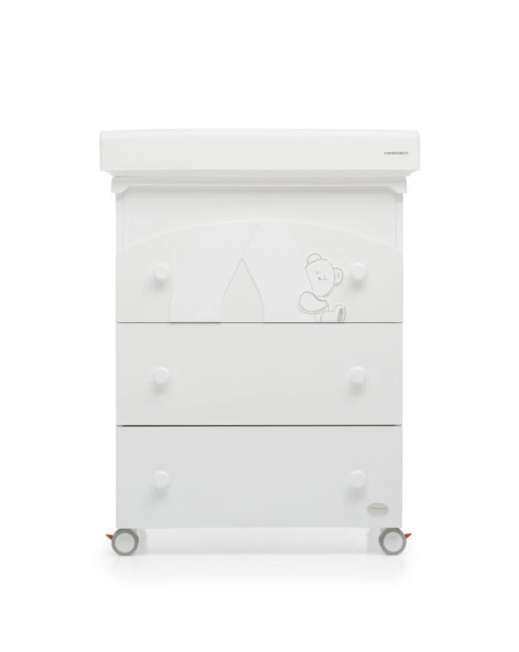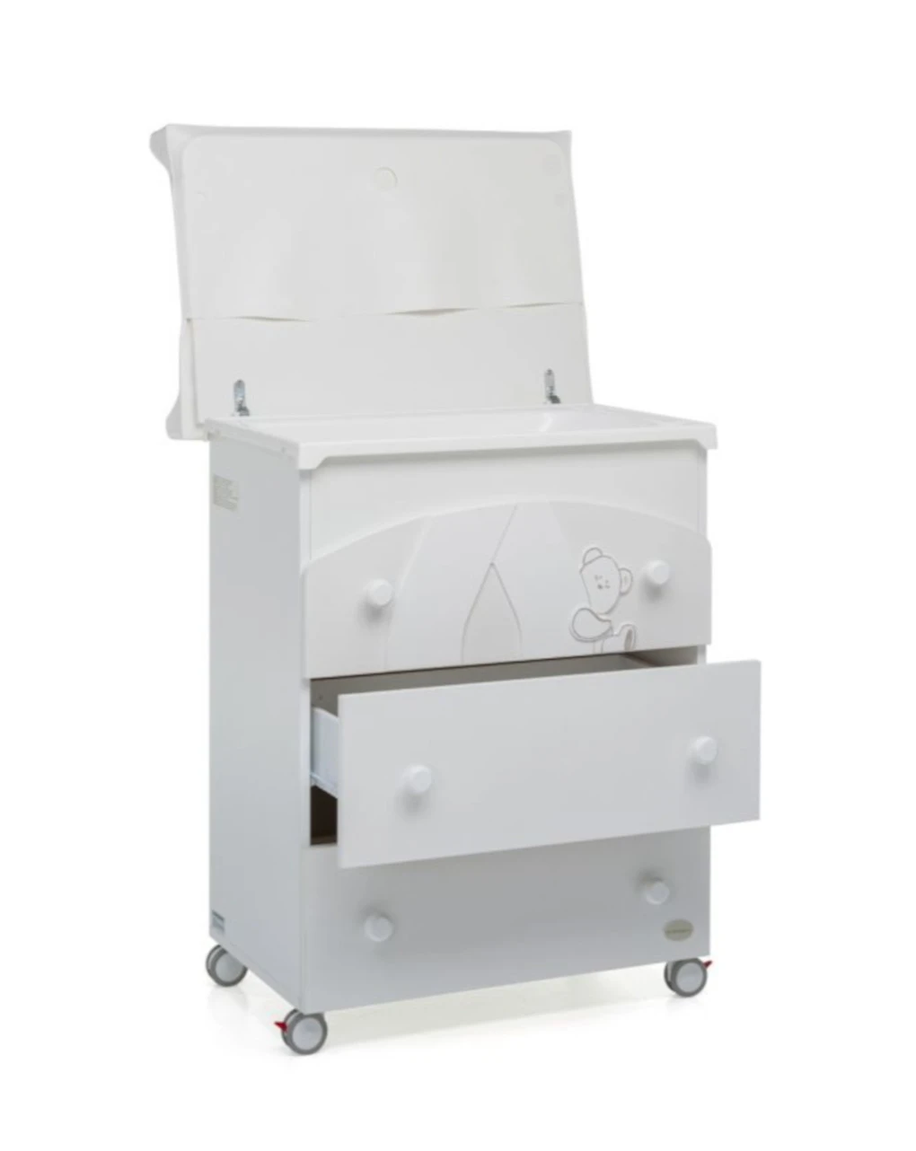 Il bagnetto fasciatoio in legno Giocoso di Foppapedretti è trasformabile in comoda cassettiera. È dotato di vaschetta per il bagnetto estraibile, tre ampi cassetti, piano ribaltabile con sistema di sicurezza ammortizzato e pratico materassino. Il cassetto superiore è caratterizzato da un simpatico orsetto che si arrampica sul decoro a intreccio. Ha tre ampi cassetti e quattro ruote gommate antigraffio, con sistema frenante, per facilitare gli spostamenti. La struttura solida e durevole nel tempo è 100% made in Italy!