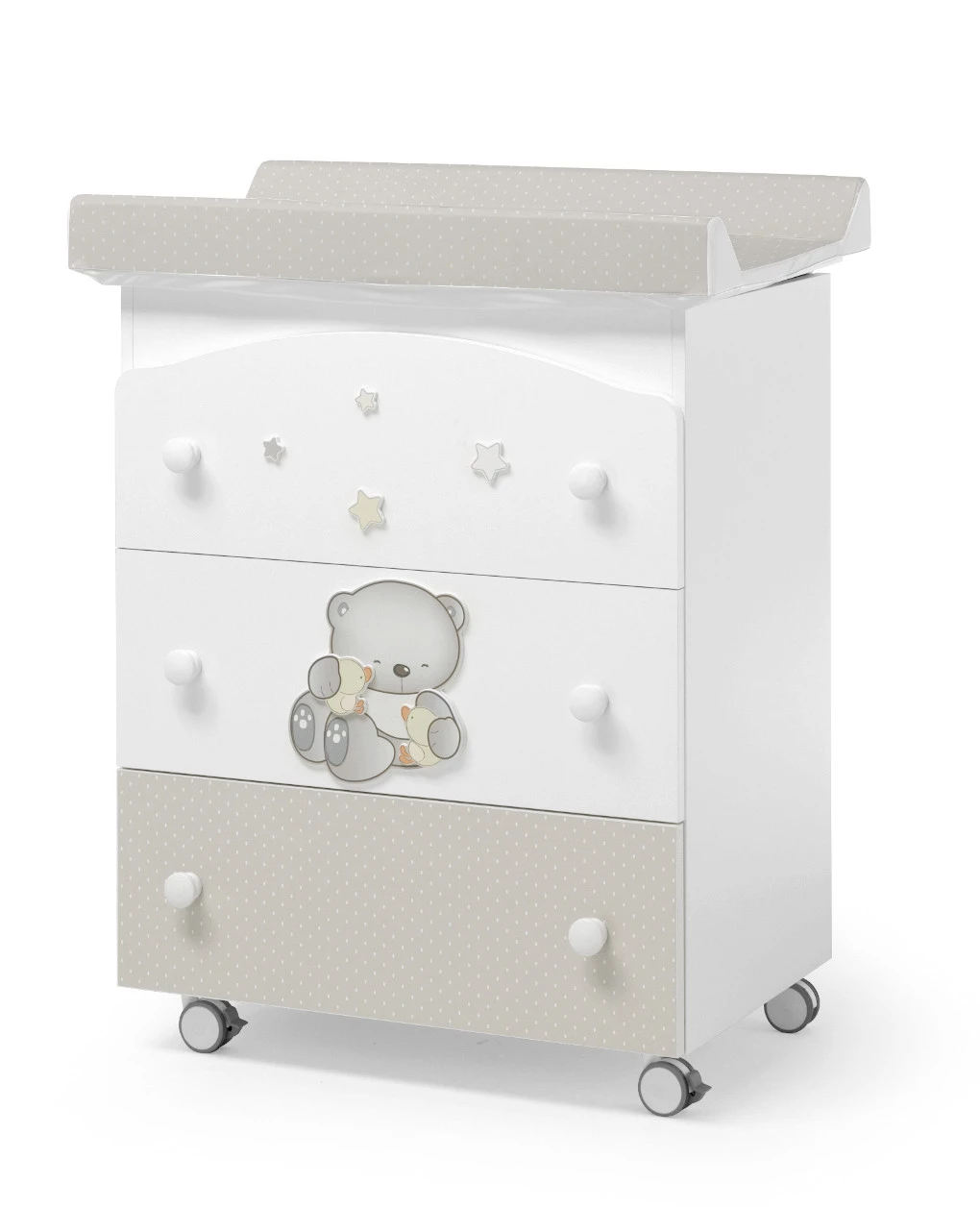 Cassettiera fasciatoio Dolce con struttura in truciolare certificato E1 a bassa emissione di formaldeide rivestito in PVC, dotata di vaschetta per il bagnetto anatomica e antiscivolo, maniglie in legno e 4 ruote di cui due con freno. Dimensioni: L81xP49xH100.5 cm.