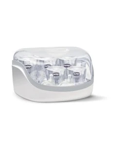 Lo Sterilizzatore per Microonde Chicco è stato pensato per facilitare l’igienizzazione quotidiana di tutti gli oggetti del bambino, come biberon e succhietti. Grazie all’utilizzo del vapore e alla temperatura elevata dell’acqua, in pochi minuti si otterrà una sterilizzazione completa e una protezione fino a 24 ore se il coperchio rimane chiuso. Può contenere fino a 5 biberon della linea Benessere e 4 della linea NaturalFeeling. Ciò nonostante le sue dimensioni sono compatte e si adatta facilmente alla maggior parte dei forni a microonde.
