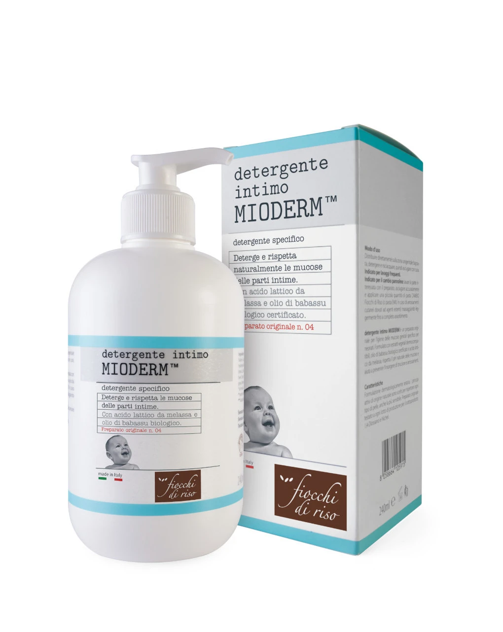 Formulato con tensioattivi delicati, il detergente intimo Mioderm™ di Fiocchi di Riso è particolarmente indicato dopo ogni cambio pannolino e contribuisce attivamente nella prevenzione degli arrossamenti delle zone più sensibili.