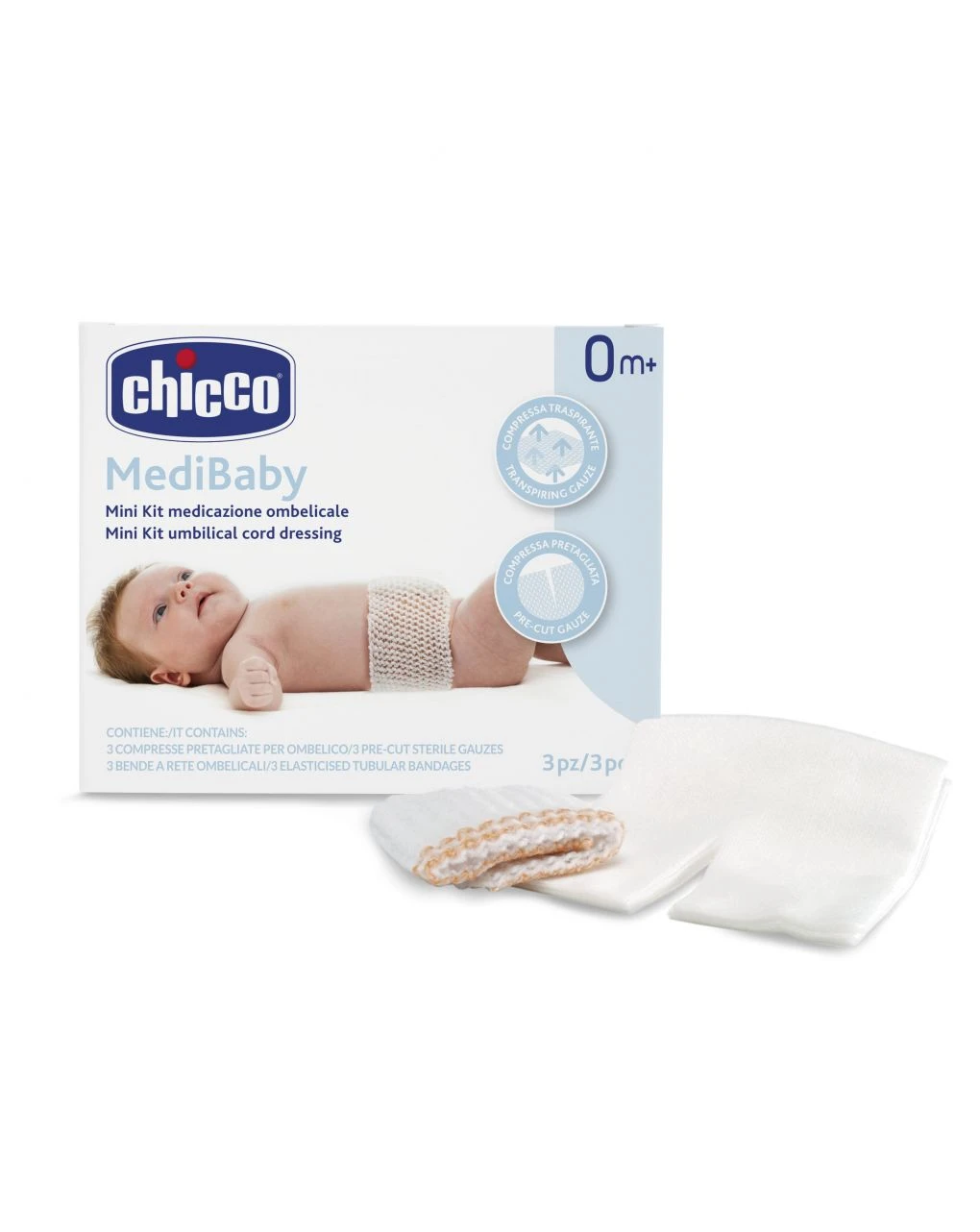 Tutto l’occorrente per la medicazione ombelicale: la benda a rete permette di fissare delicatamente la medicazione. Non stringe e non irrita la pelle, permettendo la traspirazione. Le compresse sterili, in tessuto non tessuto a 4 veli di protezione, si adattano all’addome del bambino e non si attaccano alla ferita. Contiene 3compresse sterili in tnt e 3 bende a rete.