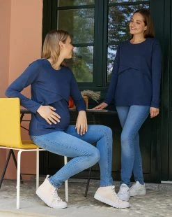 T-shirt premaman manica lunga in jersey stretch blu scuro dalla vestibilità morbida e molto confortevole. Il capo presenta lembi superiori incrociati sul davanti e due aperture sottostanti all’altezza seno, che consentono di allattare in tutta comodità.