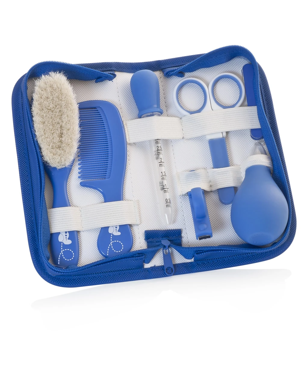 Questo set completo si compone degli elementi imprescindibili per la cura quotidiana del bebè: un contagocce, un aspiratore nasale, un pettine, una fantastica spazzola con setole naturali, pratiche forbici, un tagliaunghie e quattro lime per le unghiette del bebè. L’astuccio si apre completamente, lasciando in vista ben organizzati tutti gli elementi del set ed è delle dimensioni ideali per essere portato in borsa.
