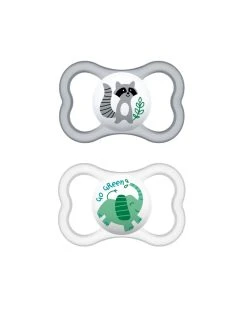 La pelle dei bimbi è particolarmente sensibile e si irrita facilmente. Con il set da 2 ciucci dal design innovativo, ha voluto creare un prodotto anti-irritazione. La mascherina dispone di fori particolarmente ampi che lasciano traspirare la pelle dei bambini. I bordi arrotondati prevengono la formazione di segni e irritazioni. La tettarella è costituita da speciale silicone SkinSoft che risulta talmente morbido e sicuro da venire istintivamente accettato dal 94% dei bambini*. Sia la tettarella che la mascherina hanno una forma simmetrica ed ergonomica, che permette al ciuccio di mantenere sempre una posizione ottimale in bocca. Il bottone è facile da afferrare e da tenere in mano, ma al contempo anche così piatto da consentire ai bambini di assumere qualunque posizione desiderino. La confezione include una custodia adatta anche per il trasporto e la sterilizzazione al microonde.