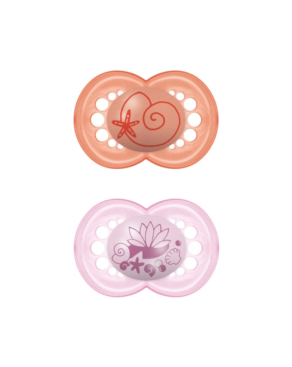 Il colore rosa dei ciucci del set da 2 è particolarmente adatto alle bambine.