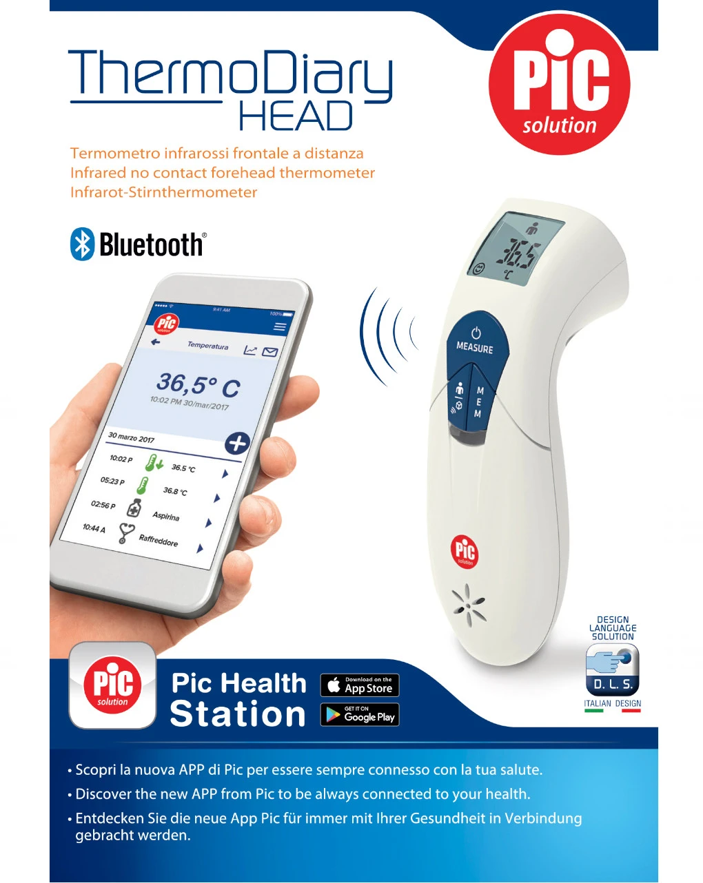 ThermoDiary EAR è il termometro a infrarossi per la misurazione auricolare della temperatura, che puoi sincronizzare con il tuo smartphone, oppure utilizzare come un normale termometro. In un semplice gesto, misura la temperatura del tuo bambino: discreto e veloce, è sufficiente inserirlo delicatamente nell’orecchio e premere un tasto, per avere in pochi secondi il valore della temperatura. Il grande display rende facile la lettura, mentre l’indicatore febbre ti segnala rapidamente se la temperatura è alta (led rosso) o nella norma (led verde). E se il tuo bambino dorme, la modalità silenziosa permette di eseguire la misurazione senza svegliarlo. ThermoDiary EAR è sincronizzabile con Pic Health Station, l’App di Pic che memorizza, gestisce e condivide tutti i valori e le rilevazioni per creare un diario della febbre sempre disponibile sul tuo smartphone. Un’interfaccia semplice e intuitiva, che una volta installata ti permette di: memorizzare i valori automaticamente; monitorare l’andamento della temperatura; annotare i sintomi e i medicinali e condividere le informazioni facilmente.
