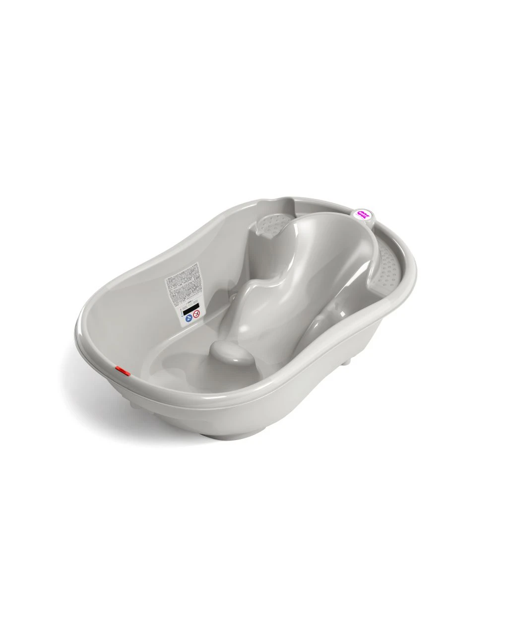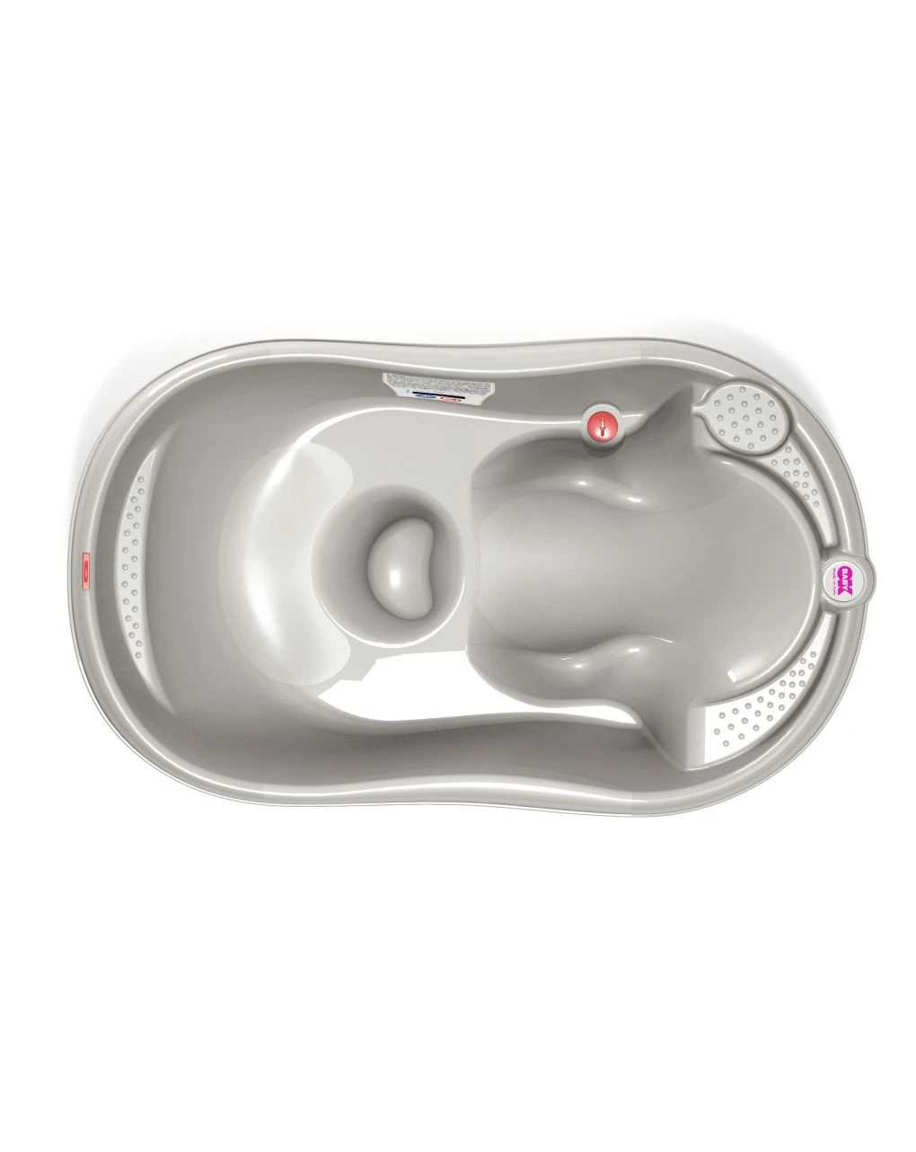 La vasca Onda di Ok Baby è dotata di tre punti d’appoggio: due ascellari e uno inguinale. Termometro digitale incorporato. Può essere fissata alla vasca da bagno della casa.
