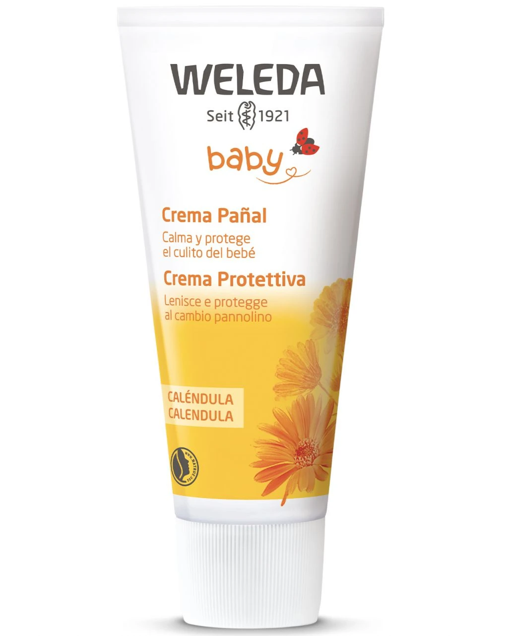 Baby Crema Protettiva Calendula di Weleda è una crema per il cambio pannolino ideale per lenire i rossori della delicata pelle del bebè ad ogni cambio. La sua formula a base di estratti di fiori di calendula, lanolina, ossido di zinco e cera d’api protegge la pelle, aiutando a prevenire eventuali arrossamenti e irritazioni.